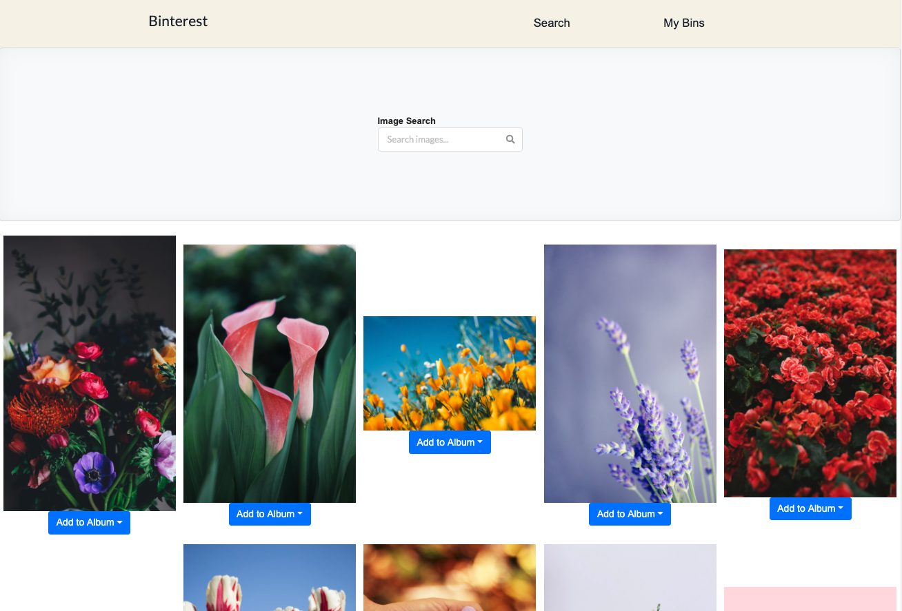 Pinterest clone that displays a list of albums and images saved by the user. Search for pictures that add them to your album!